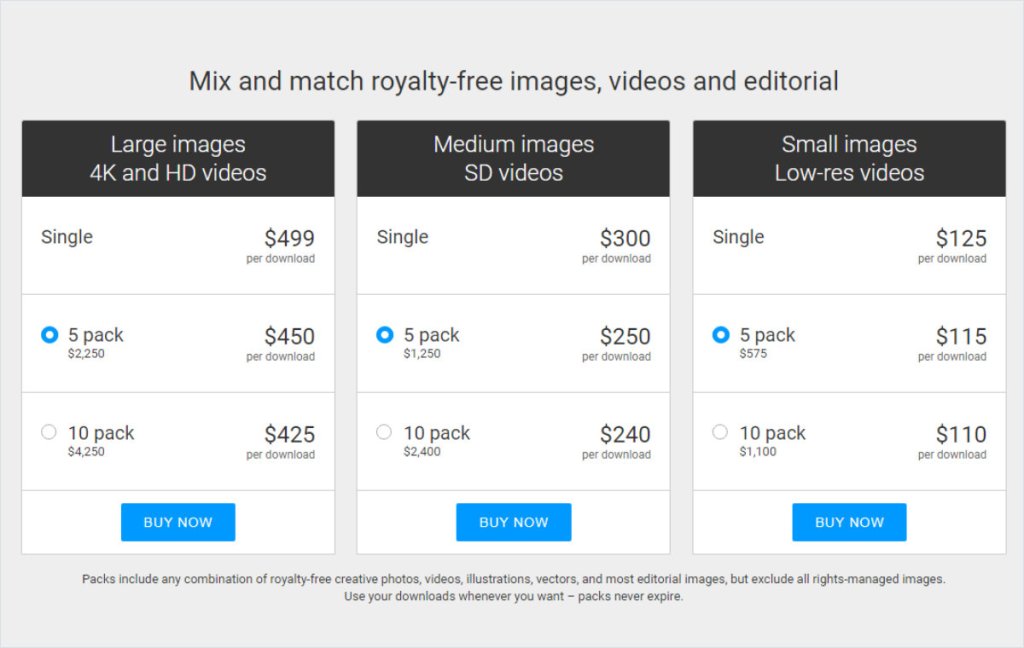 Getty Images Categorizes their pricing packages based on image quality, the higher the image quality the more expensive.