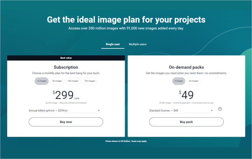 With shutterstock On Demand Packs you can buy $9.80 per image (up to 5 Images) on lowest plan for $49. With Subscription plan you can get $2.49 per image (up to 10 Images) on lowest subscription annual plan for $299.