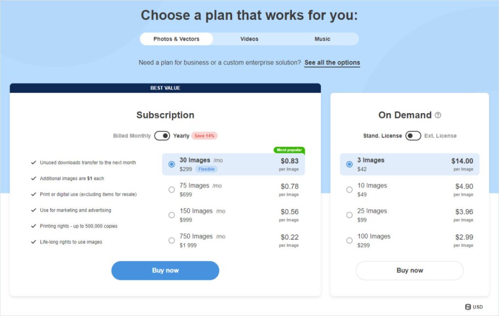 Last but not least, the best subscription annual plan goes to Depositphotos with up to 30 downloadable images /month for $299.