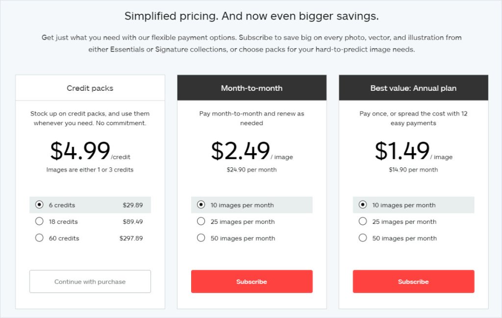 Istockphoto have different technique for pricing plan, beside subscription plan they also using credit packs to purchases the image, each images are either 1 or 3 credits to buy. Each Credit cost $4.99