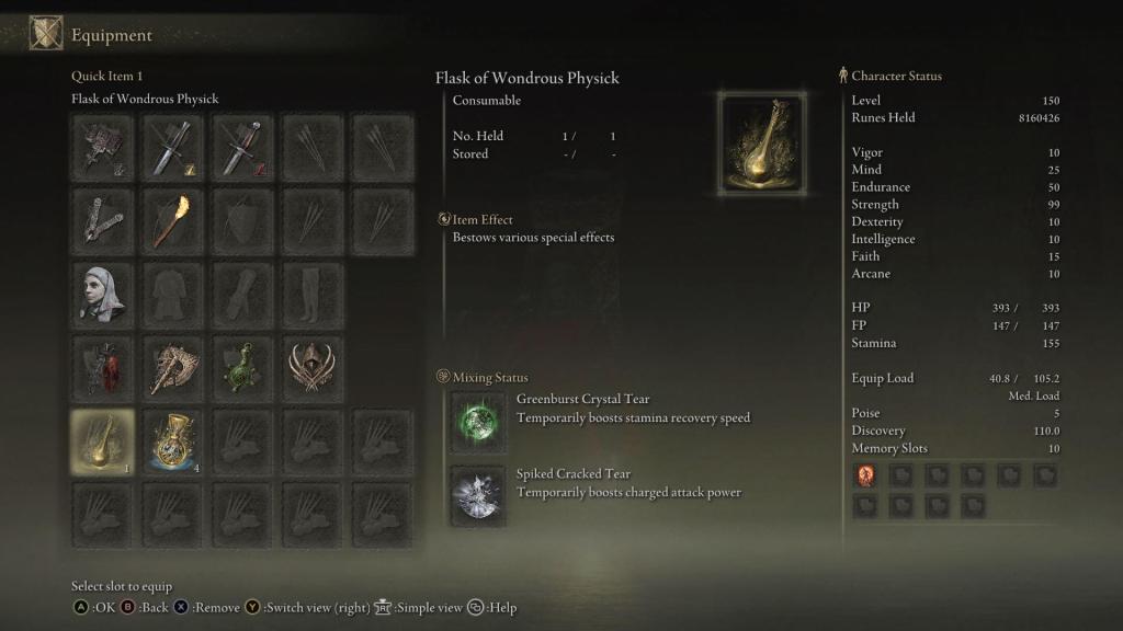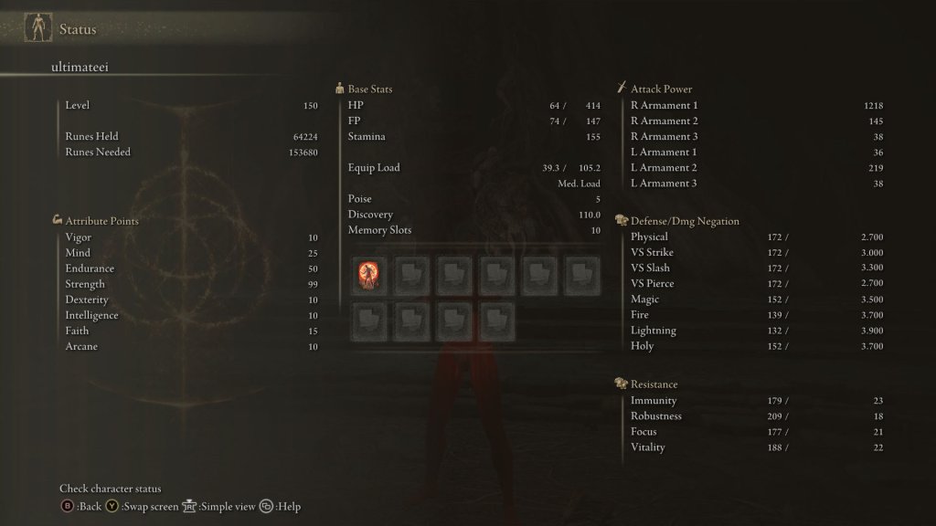 | Status Level 150 | Vigor: 10 Mind: 25 Endurance: 50 Strength: 99 Dexterity: 10 Intelligence: 10 Faith: 15 Arcane: 10 | |