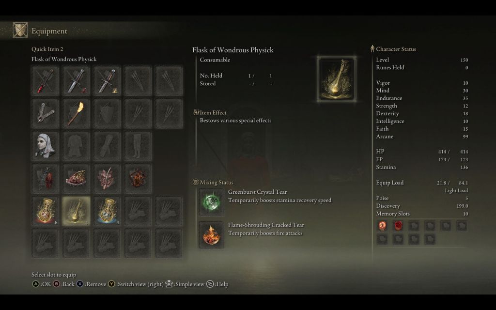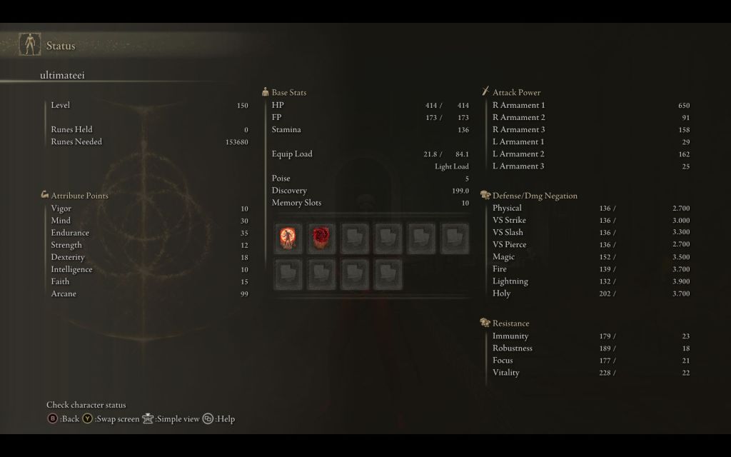 | Status Level 150 | Vigor: 10 Mind: 30 Endurance: 35 Strength: 12 Dexterity: 18 Intelligence: 10 Faith: 15 Arcane: 99 | |