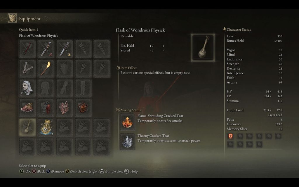 | Status Level 150 | Vigor: 10 Mind: 24 Endurance: 30 Strength: 20 Dexterity: 21 Intelligence: 10 Faith: 15 Arcane: 99 | |