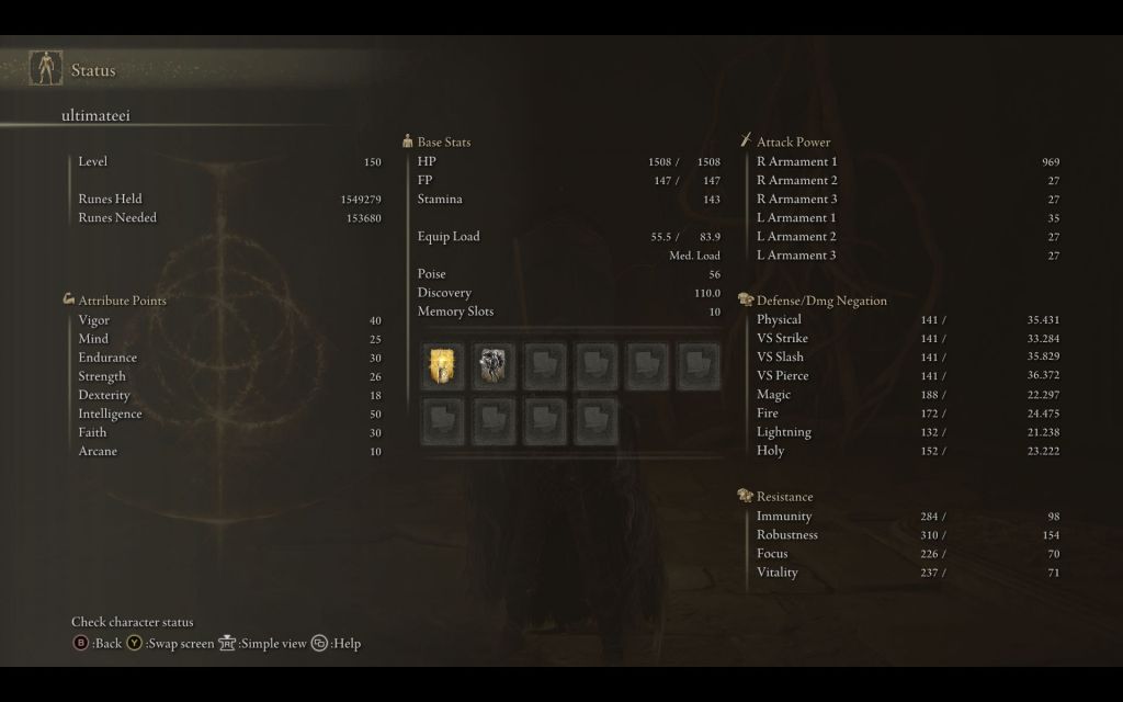 | Status Level 150 | Vigor: 40 Mind: 25 Endurance: 30 Strength: 26 Dexterity: 18 Intelligence: 50 Faith: 30 Arcane: 10 | |