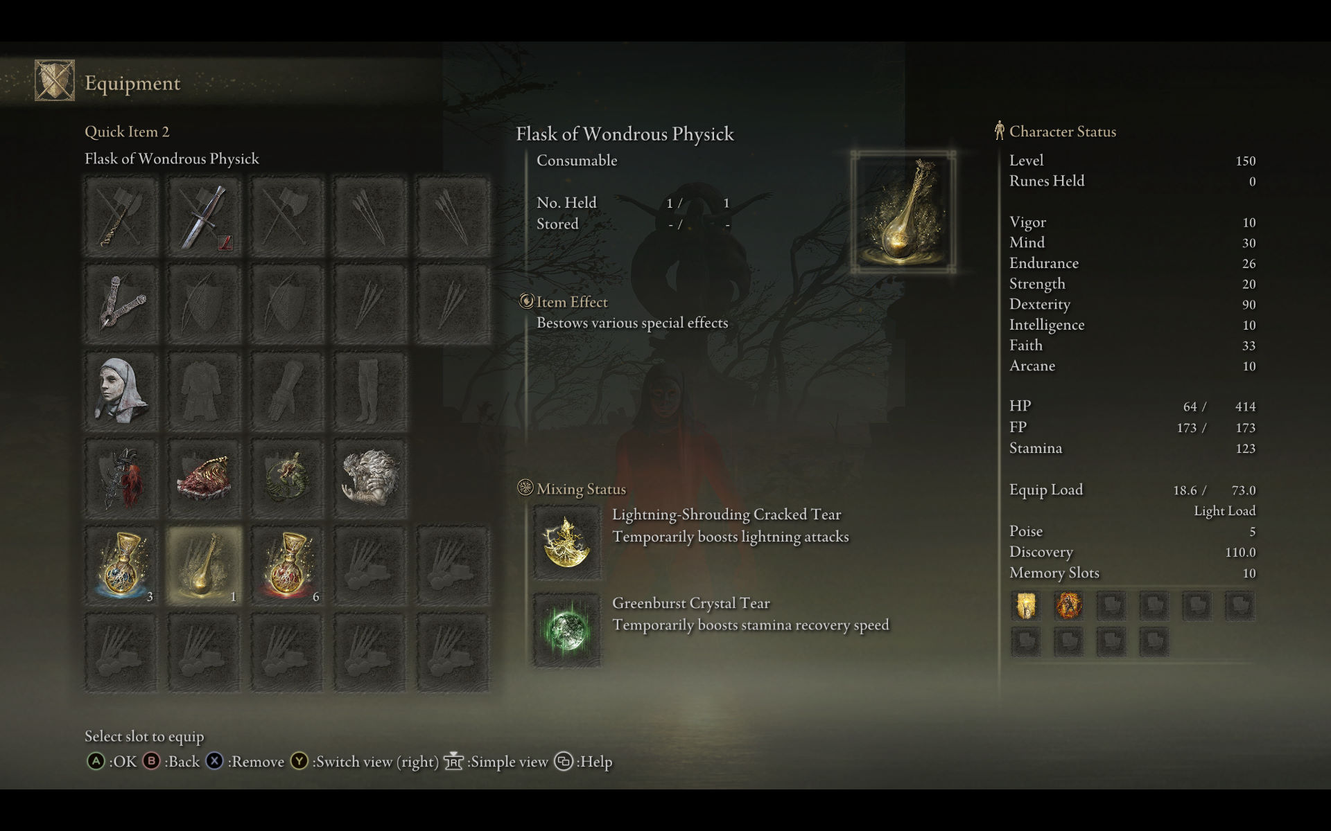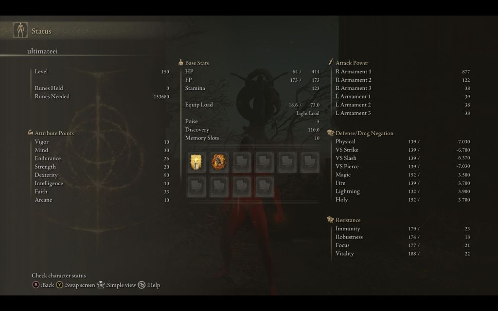 | Status Level 150 | Vigor: 10 Mind: 30 Endurance: 26 Strength: 20 Dexterity: 90 Intelligence: 10 Faith: 33 Arcane: 10 | |