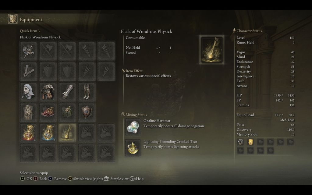 | Status Level 150 | Vigor: 40 Mind: 24 Endurance: 32 Strength: 55 Dexterity: 28 Intelligence: 10 Faith: 30 Arcane: 10 | |