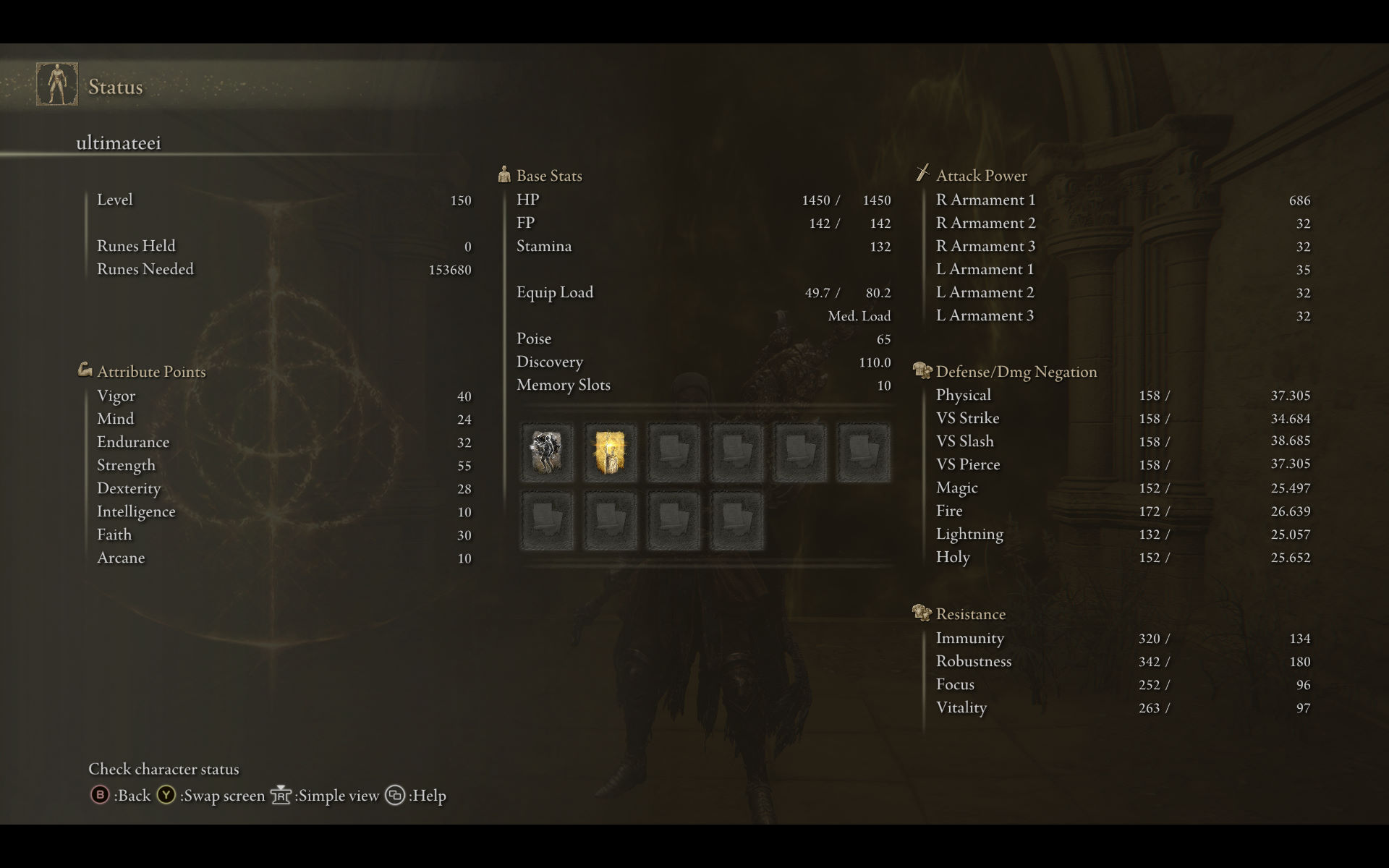 | Status Level 150 | Vigor: 40 Mind: 24 Endurance: 32 Strength: 55 Dexterity: 28 Intelligence: 10 Faith: 30 Arcane: 10 | |