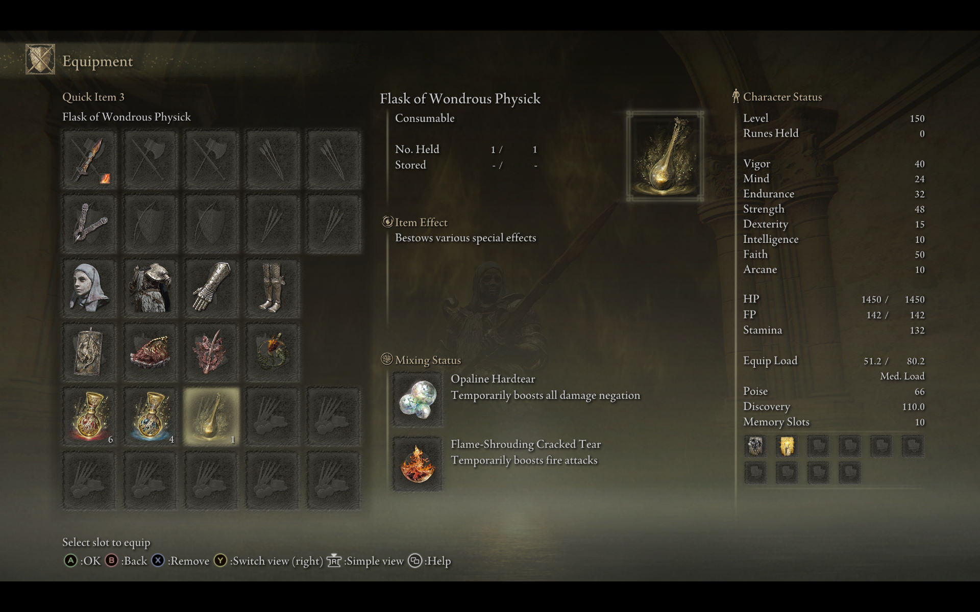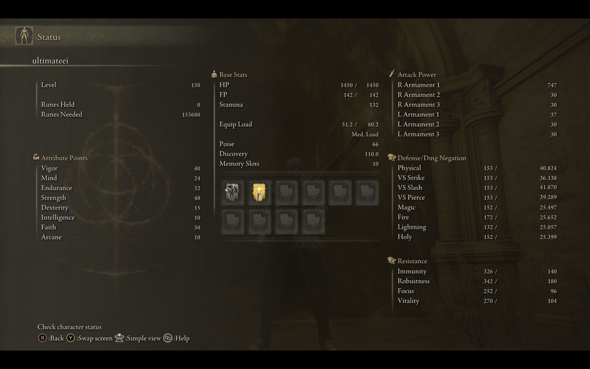 | Status Level 150 | Vigor: 40 Mind: 24 Endurance: 32 Strength: 48 Dexterity: 15 Intelligence: 10 Faith: 50 Arcane: 10 | |