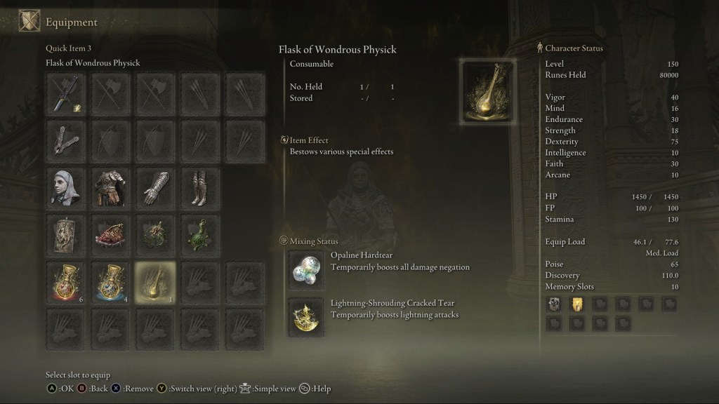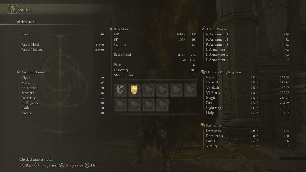 | Status Level 150 | Vigor: 40 Mind: 16 Endurance: 30 Strength: 18 Dexterity: 75 Intelligence: 10 Faith: 30 Arcane: 10 | |