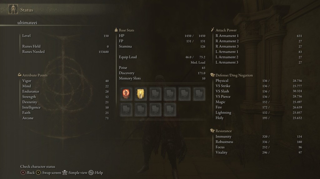 | Status Level 150 | Vigor: 40 Mind: 22 Endurance: 28 Strength: 12 Dexterity: 21 Intelligence: 10 Faith: 25 Arcane: 71 | |