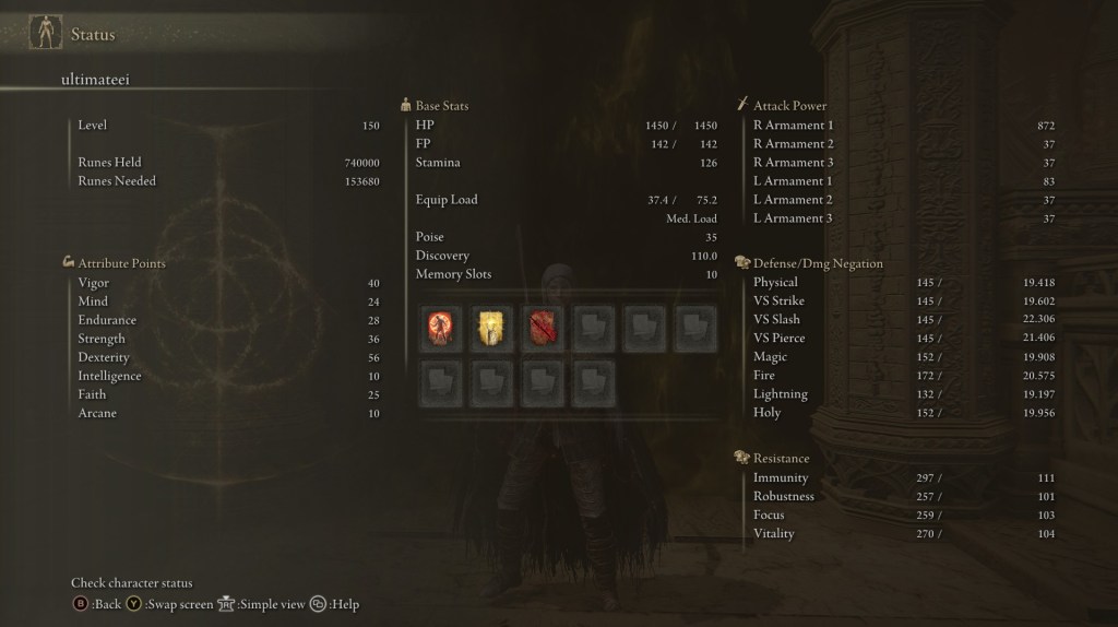 | Status Level 150 | Vigor: 40 Mind: 24 Endurance: 28 Strength: 36 Dexterity: 56 Intelligence: 10 Faith: 25 Arcane: 10 | |