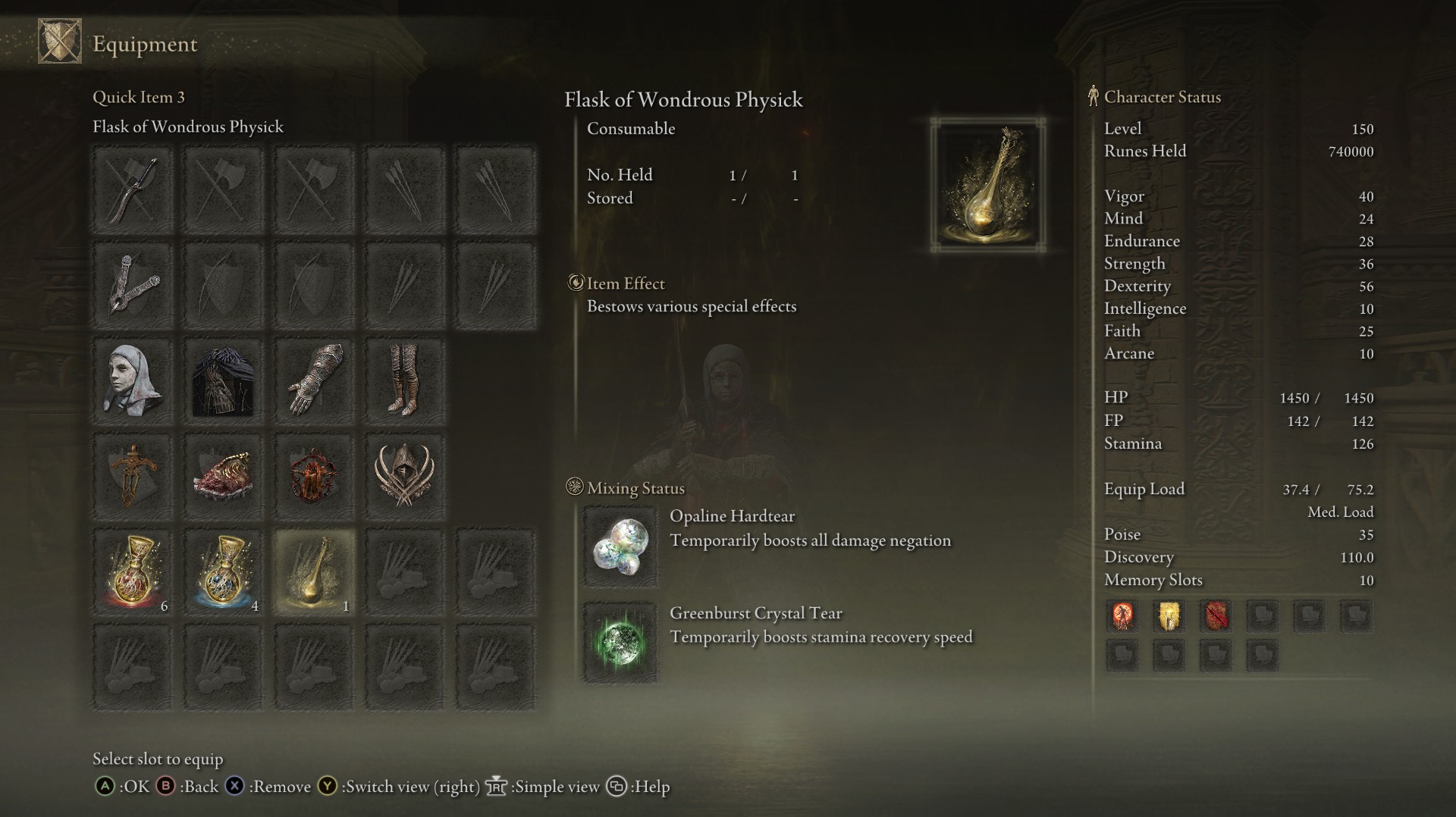 | Status Level 150 | Vigor: 40 Mind: 24 Endurance: 28 Strength: 36 Dexterity: 56 Intelligence: 10 Faith: 25 Arcane: 10 | |