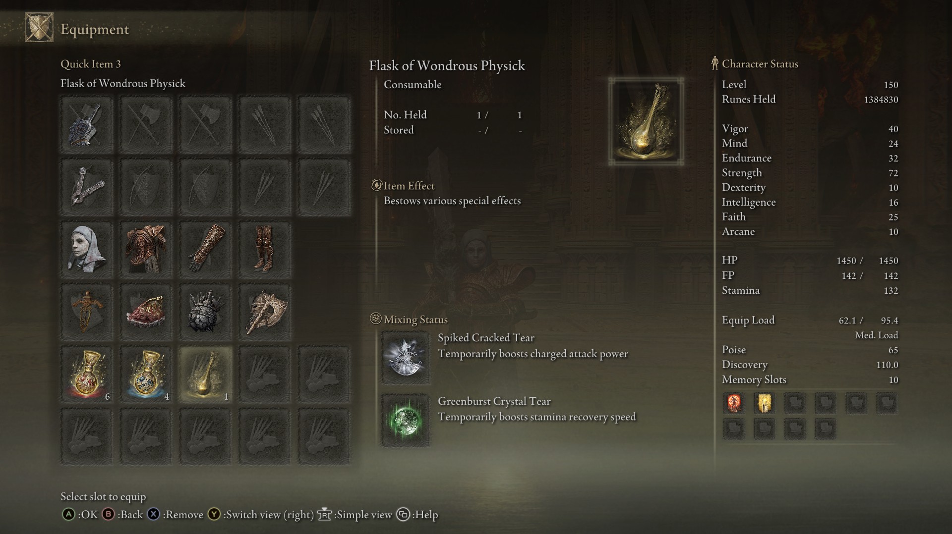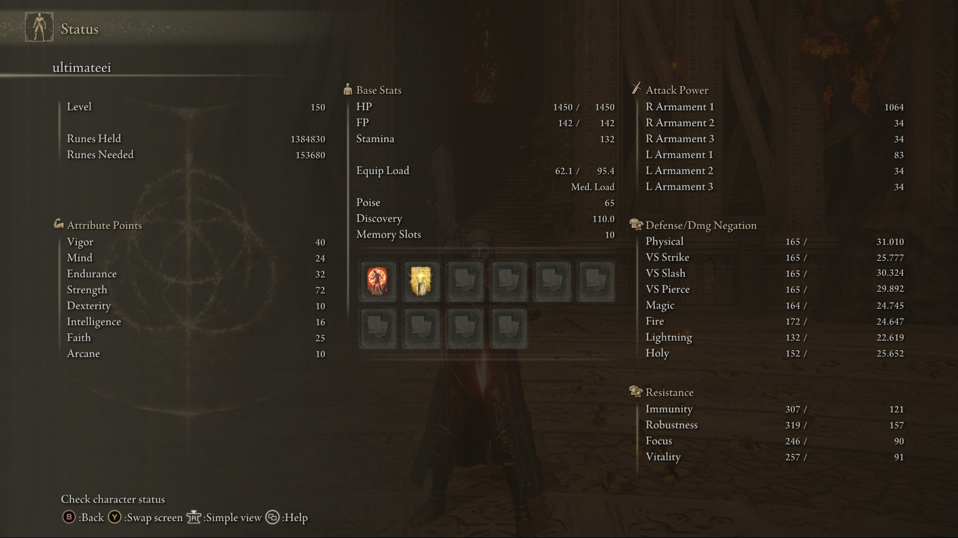 | Status Level 150 | Vigor: 40 Mind: 24 Endurance: 32 Strength: 72 Dexterity: 10 Intelligence: 16 Faith: 25 Arcane: 10 | |