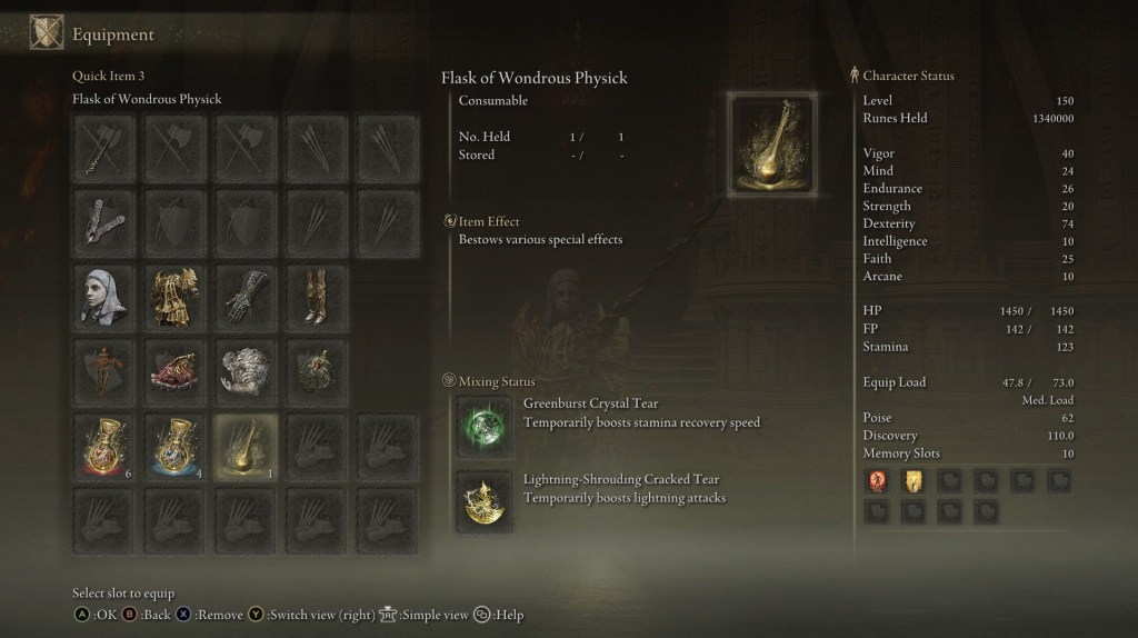 | Status Level 150 | Vigor: 40 Mind: 24 Endurance: 26 Strength: 20 Dexterity: 74 Intelligence: 10 Faith: 25 Arcane: 10 | |