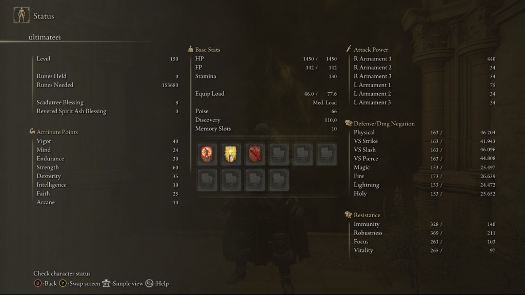 | Status Level 150 | Vigor: 40 Mind: 24 Endurance: 30 Strength: 60 Dexterity: 35 Intelligence: 10 Faith: 25 Arcane: 10 | |