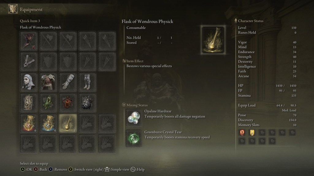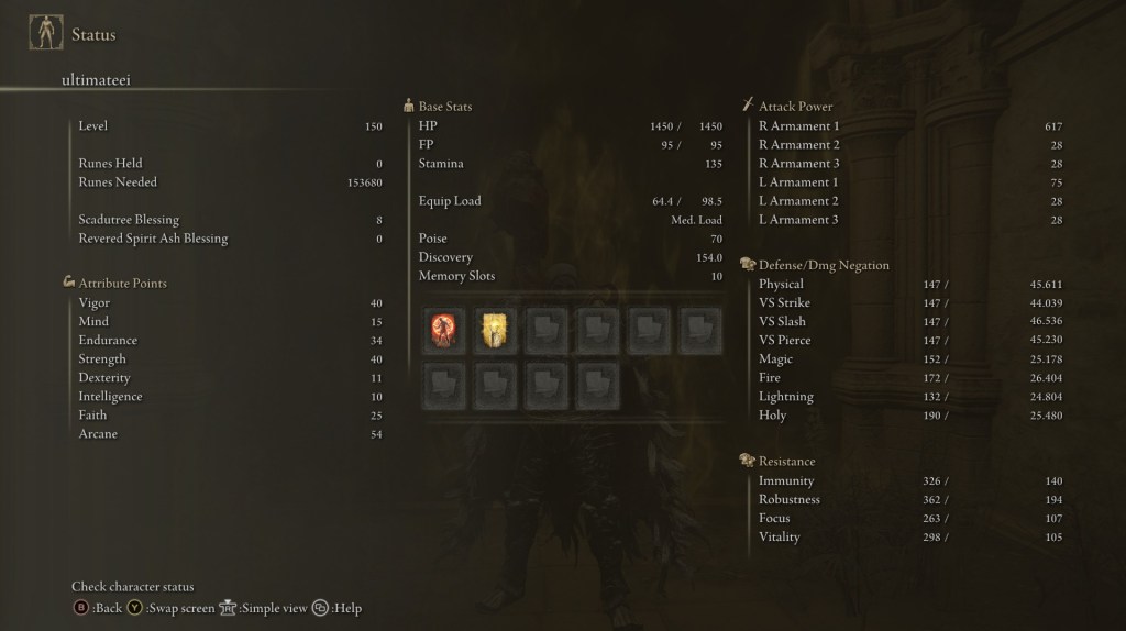 | Status Level 150 | Vigor: 40 Mind: 15 Endurance: 34 Strength: 40 Dexterity: 11 Intelligence: 10 Faith: 25 Arcane: 54 | |
