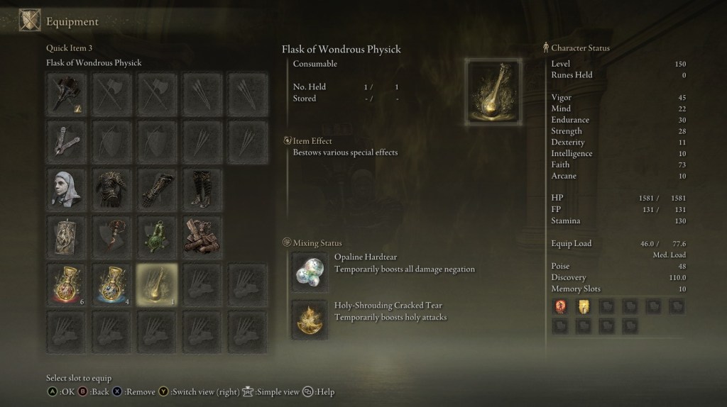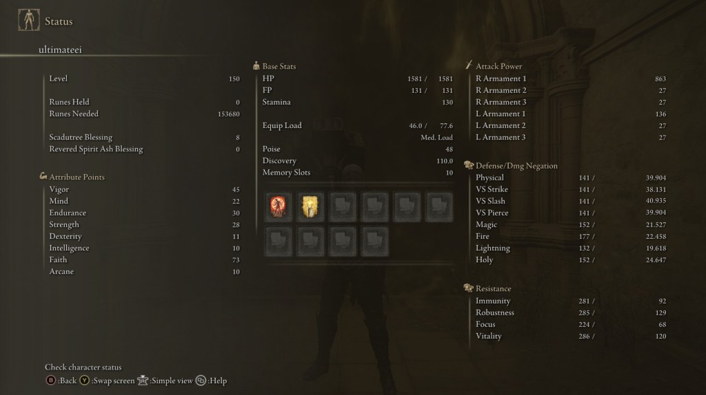 | Status Level 150 | Vigor: 45 Mind: 22 Endurance: 30 Strength: 28 Dexterity: 11 Intelligence: 10 Faith: 73 Arcane: 10 | |