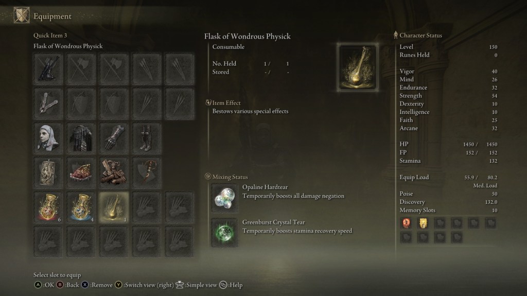 | Status Level 150 | Vigor: 40 Mind: 26 Endurance: 32 Strength: 54 Dexterity: 10 Intelligence: 10 Faith: 25 Arcane: 32 | |