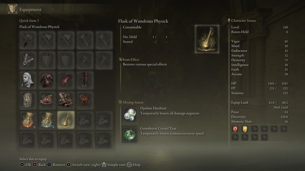 | Status Level 150 | Vigor: 45 Mind: 20 Endurance: 32 Strength: 12 Dexterity: 75 Intelligence: 10 Faith: 25 Arcane: 10 | |