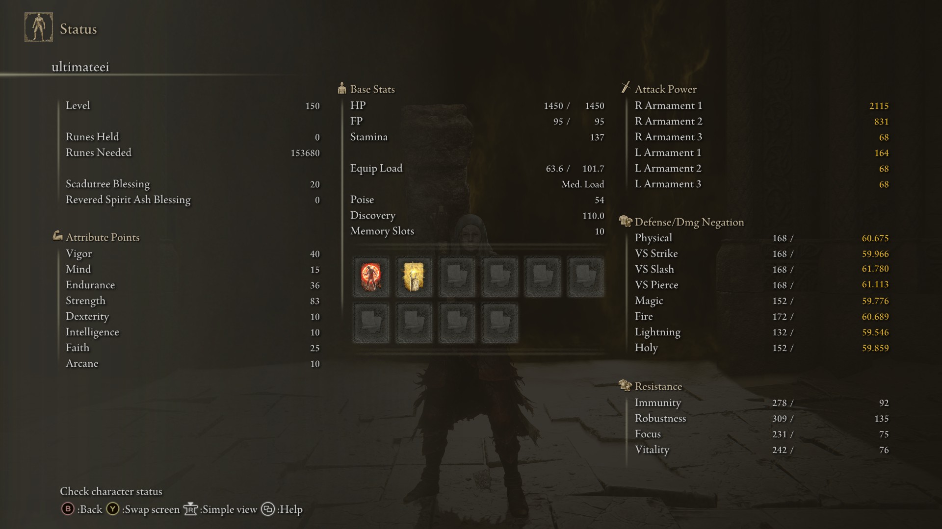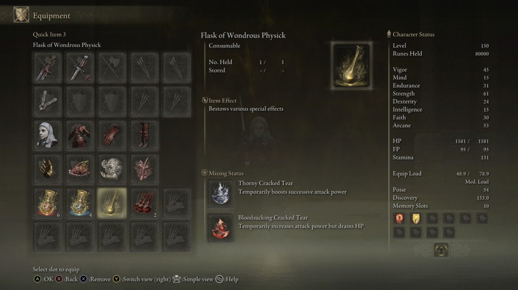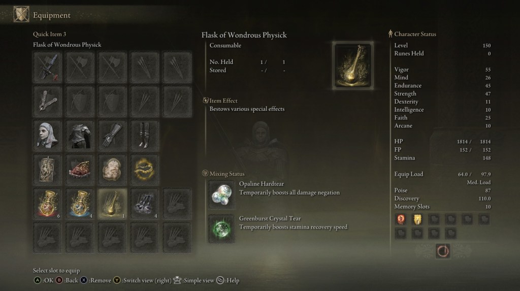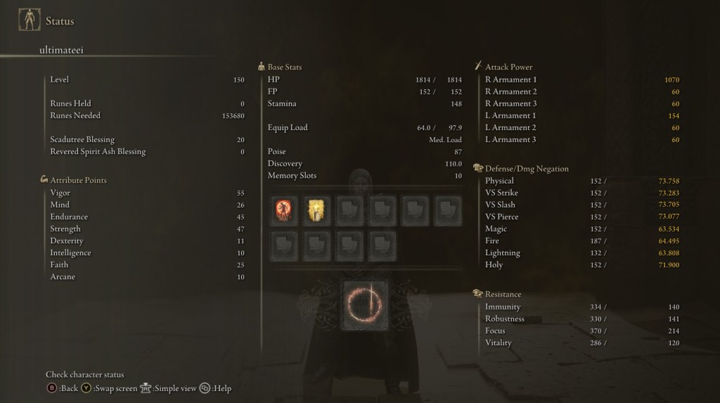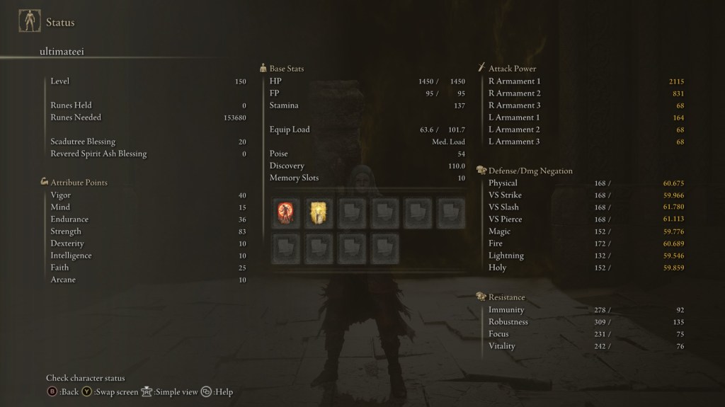 Sword Lance with Blood Tax Ash of war to steal enemy health, Ironjar Aromatic drastically boosts poise and physical damage negation is the secret recipe for immortality.