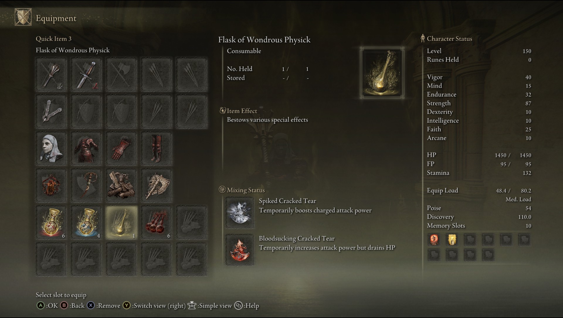 | Status Level 150 | Vigor: 40 Mind: 15 Endurance: 32 Strength: 87 Dexterity: 10 Intelligence: 10 Faith: 25 Arcane: 10 | |