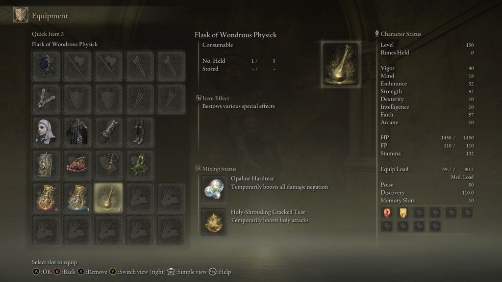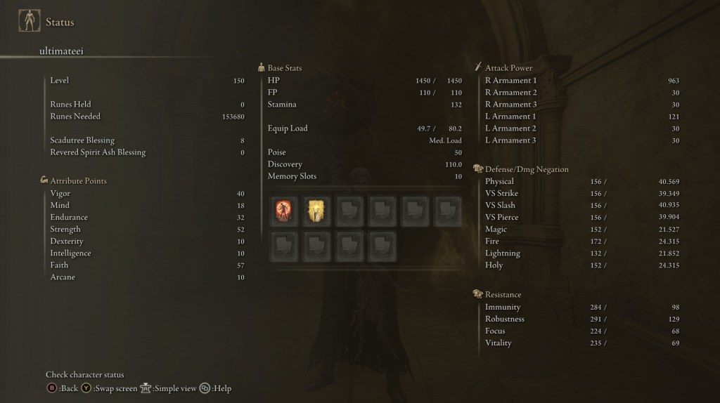 | Status Level 150 | Vigor: 40 Mind: 18 Endurance: 32 Strength: 52 Dexterity: 10 Intelligence: 10 Faith: 57 Arcane: 10 | |