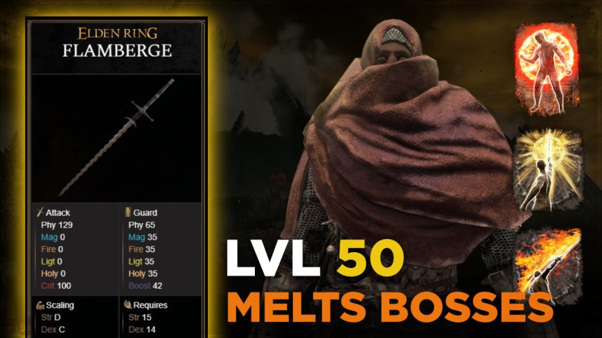 Flamberge is a Greatsword that scale primary with Strength and Dexterity. It has bleed build up by default, also can be infused with Ashes of War and buffed with Magic or Consumables. Combine with Flaming Strike Ash of War, You can unleash a burst of flame, then execute a powerful sweeping attack that ignites your…