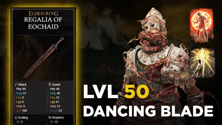 Regalia of Eochaid is a Straight Sword that scale primary with Strength, Dexterity and Arcane. This weapon has a skill called Eochaid’s Dancing Blade, with this skill you infuse the sword with energy and fling it forward in a corkscrew attack. The blade can deal Enourmous Succesive attack Damage while spinning violently. By Holding down…
